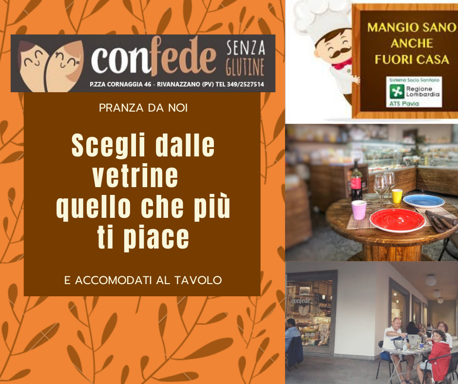 Da ConFede Senza Glutine puoi scegliere dalle vetrine quello che ti aggrada e portarlo a casa, oppure degustarlo in loco accomodandoti in uno dei tavoli interni o esterni messi a disposizione della clientela.