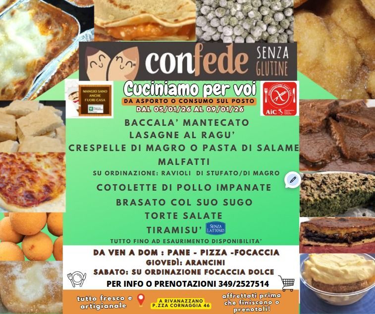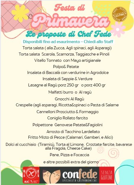 Ogni giorno pane, pizza e focaccia e tante proposte di gastronomia, dall'antipasto al dolce, sono preparate da chef Fede con materie prime di qualità esclusivamente senza glutine, garantendo l'impossibilità di contaminazione crociata perché realizzate nel laboratorio artigianale dedicato.